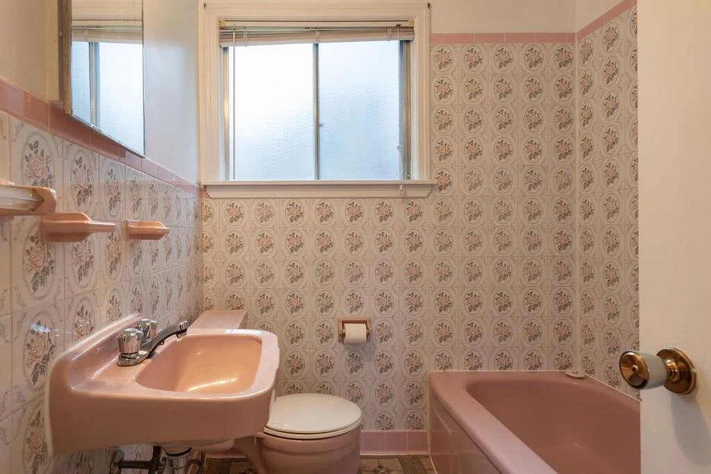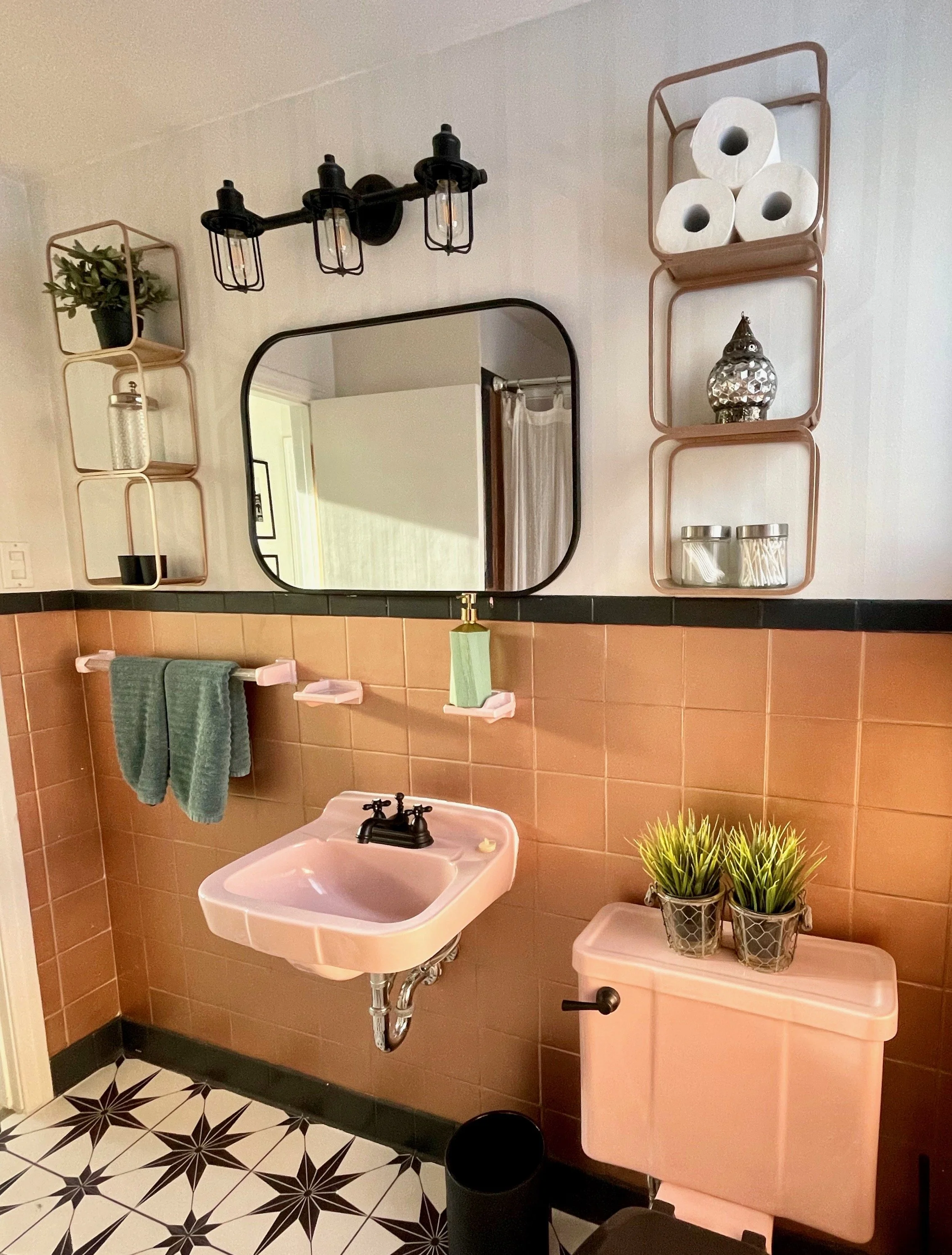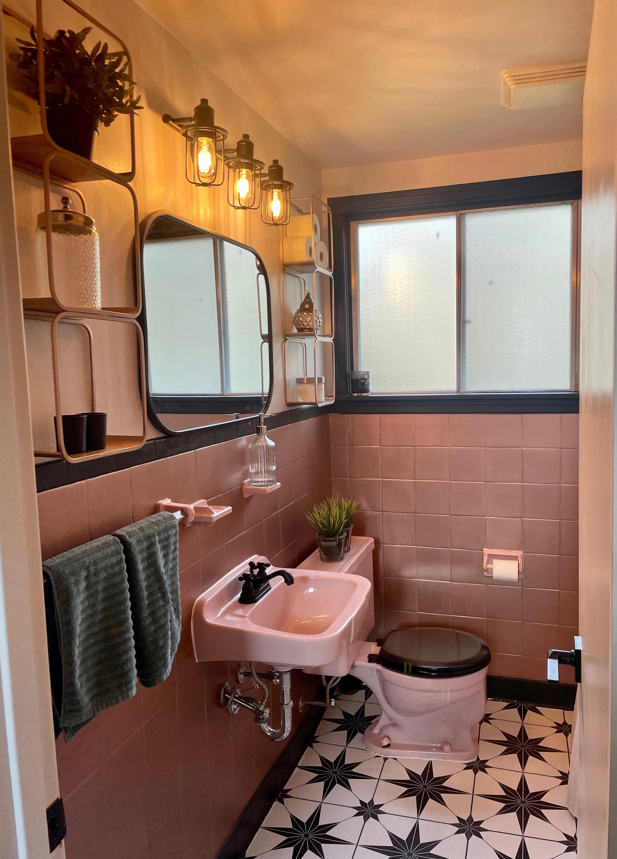In the lower bathroom, the original 1960s fixtures were preserved, but we infused the space with a fresh, funky design that nods to Art Deco influences, blending vintage charm with a bold, modern twist.