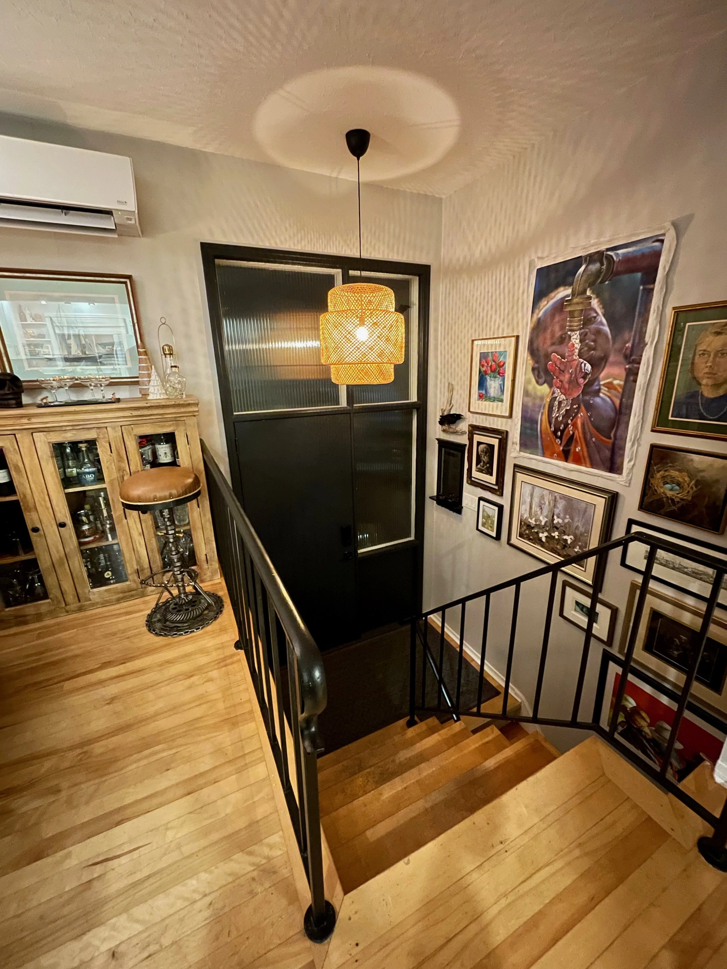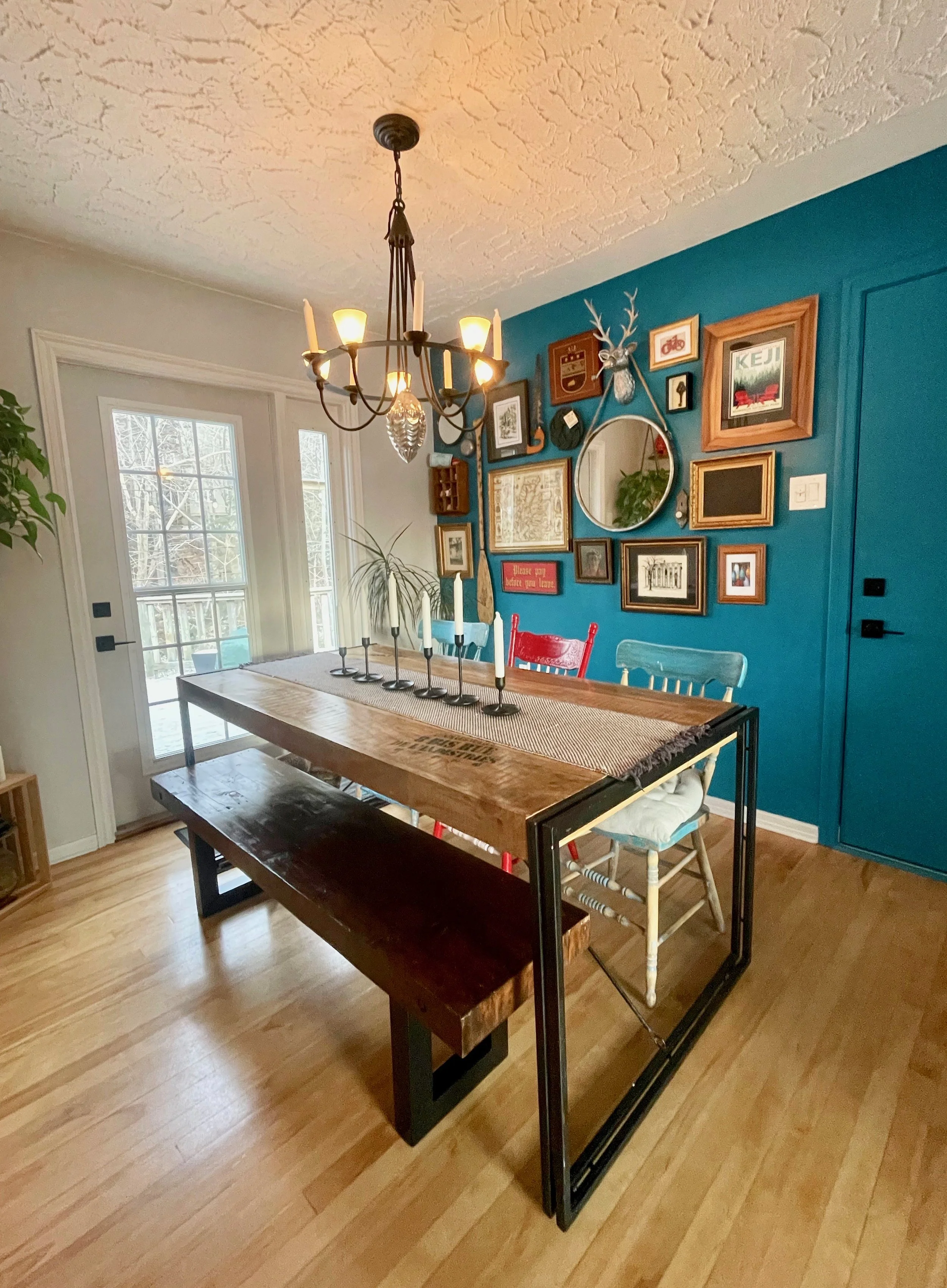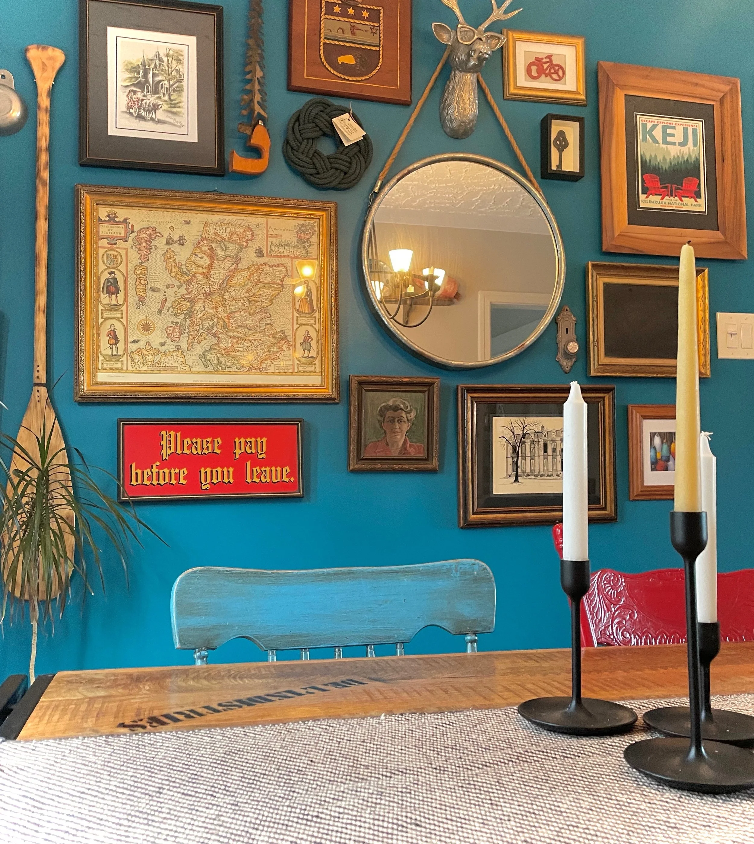 With a love for art and an eclectic aesthetic, the homeowners embraced bold design choices. Their collection is extensive, but wall space was limited, so we curated standout art accent walls—one in the entryway and another in the dining room—to display their favourite pieces in a visually compelling way.